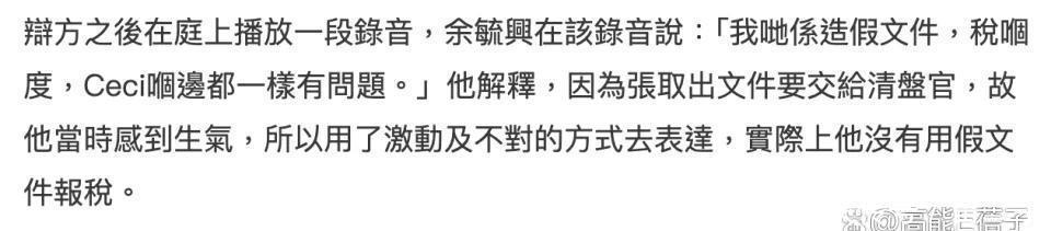 所以,早年,张柏芝和余毓兴就闹翻了?这次张柏芝还顺便吐槽,余毓兴曾经消失了几年,还曾骗她有癌症。而余毓兴这边,主要控诉的就是他和张柏芝一度失去联络,张没有完成合约上的演出。之后辩方还在庭上放了一段录音,余毓兴在录音里提到“我们是造假文件……”对此他解释,因为张柏芝取出文件要交给清盘官,他觉得很生气,就用了激动的方式去表达,但实际上没有用假文件报税。这一回应,被辩方质疑,余毓兴心平气和地说话,肯定是觉得造假文件没有问题……